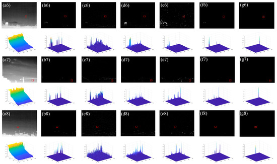 Test images and detection results of different methods. (a1–a8) test images and corresponding 3D diagrams of Sequence 1 to Sequence 8, respectively, (b1–b8) processed images of method NWIE and corresponding 3D diagrams, (c1–c8) processed image of methods DWT and corresponding 3D diagrams, (d1–d8) processed images of method SSS-GW and corresponding 3D diagrams, (e1–e8) processed images of method TDGS and corresponding 3D diagrams, (f1–f8) processed images of method GSS-ELCM and corresponding 3D diagrams, (g1–g8) processed images of our method and corresponding 3D diagrams. Red rectangle marks the location of the real small target.