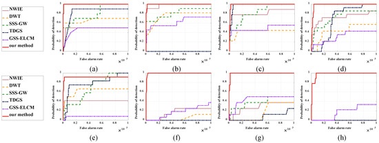 ROC curves of different methods for eight real images. (a) Sequence 1, (b) Sequence 2, (c) Sequence 3, (d) Sequence 4, (e) Sequence 5, (f) Sequence 6, (g) Sequence 7, (h) Sequence 8.