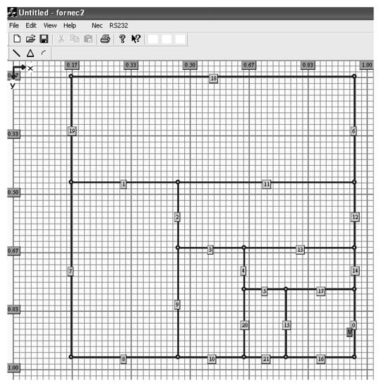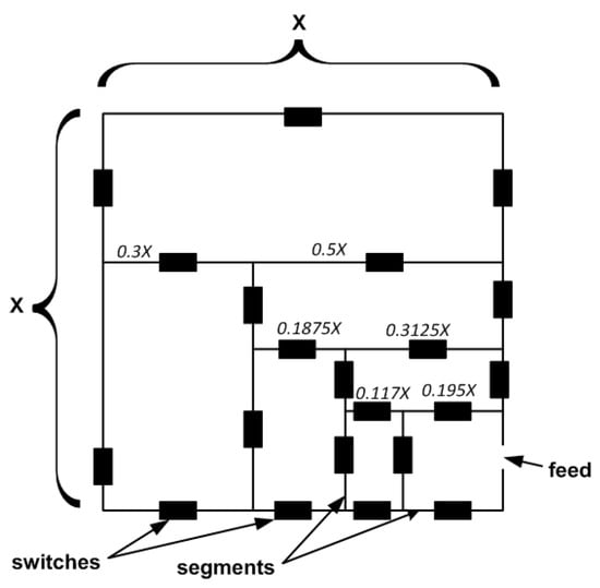 For the investigation, a square shape antenna template was assumed (see Figure 1). The skeleton of an antenna had a lattice structure with planar paths (segments) interconnected by 21 controllable switches that gave 221 independent configurations. The state (on/off) of the switch was controlled by a microprocessor. Assuming that the edges of the antenna were X long (X is an antenna size), the first internal segments were divided into the ratio 5/8X and 3/8X, while the next internal rectangles in the radiating lattice were unequally divided with the ratio 3/5. Such a method of division made the structure of radiating elements somehow similar to fractal.