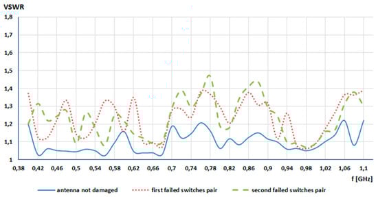 Taking into consideration the graph from Figure 4, it is seen that the switch failure impact on antenna VSWR was small. For the first pair of damaged switches (9, 13), the averaged VSWR was 1.249, and for second pair (2, 15) it was 1.251. For the full-working template, the averaged VSWR was 1.10, which is only 0.15 lower in comparison to the damaged template.