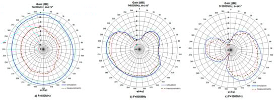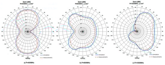 After a series of measurements, gathered results were presented in the form of radiation patterns and compared with the simulation ones. The patterns were shown for three frequencies, i.e., for 400 MHz, 800 MHz and 1000 MHz in horizontal and elevation planes. The patterns are presented in Figure 6 and Figure 7, respectively. According to the achieved results, the behavior of the measured patterns was similar to the simulation ones. What is more, the measured patterns were slightly narrower than simulated. The maximum difference between patterns was 2.3 dB. The investigated antenna (for operation at 1000 MHz) had a maximum gain (Gmax) value equal to 4.78 dBi (simulation) and 3.83 dBi (measurement). For operation at 400 MHz, Gmax = 3.83 dBi (simulation) and 2.69 dBi (measurement), while for operation at 800 MHz, Gmax = 4.17 dBi (simulation) and 3.83 dBi (measurement).