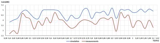 In addition to radiation patterns, gain values in the frequency from 400 MHz to 1100 MHz were investigated, as seen in Figure 8. The maximum gain value was 5.1 dBi (simulation) and 4 dBi (measurement). Measured gain values lower than the simulation ones indicated the level of losses introduced by non-ideal switches. The maximum difference between simulation and measurement results was 1.48 dB.