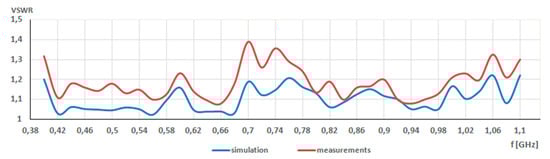 The last step of measurements concerned the determination of VSWR values and their comparison with the values obtained during the simulation. As a result, the VSWR chart was achieved and it is presented in Figure 9. The simulations show that the VSWR values changed from 1.22 to 1.02, while measured VSWR changed from 1.3 to 1.05. Therefore, a good agreement between simulation and measurement results was achieved. What is more, it indicated that biasing lines of switches had a negligible impact on the antenna performance.