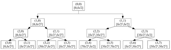 where the space of wavelet function is , the scale factor is , is the orthogonal sum of the two subspaces. Equation (2) means that the space of the real number, , is the orthogonal sum of wavelet subspace according to different scale factors. Wavelet packet analysis can improve the frequency resolution by subdividing the frequency band in binary form.