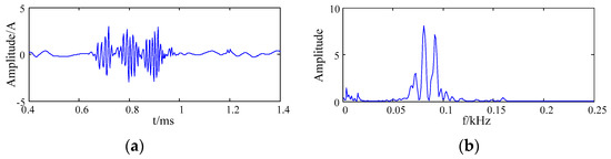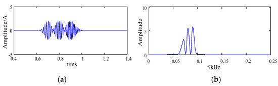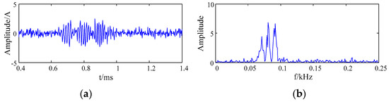 The signal was composed of three pulse signals. Among them, , and were the frequencies of the three harmonic signals, the values of parameters were = 60 kHz, = 80 kHz and = 100 kHz, = 0.7 ms, = 0.8 ms, = 0.9 ms, = 0.0001, = 0.00015, and = 0.0002, the sampling frequency was 500 kHz. The waveform and the frequency spectrum of the simulation signal are shown in Figure 3.