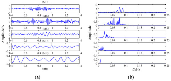 The finite IMF components were decomposed from the simulation signal by EMD. Among them, the residual components were monotonous and small, which can be ignored. The IMF component waveforms and the frequency spectrum of the simulation signal by EMD are shown in Figure 5.