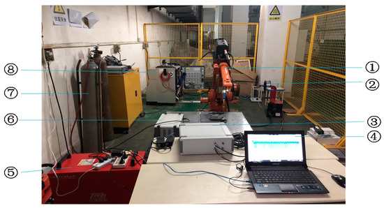 Experiment and testing platform for the double pulse MIG welding, ①Welding robot; ②Welding wire feeding mechanism; ③the are signal acquisition box; ④Computer; ⑤Welding machine; ⑥the arc sensor box; ⑦The argon gas storage tank; ⑧The power supply.