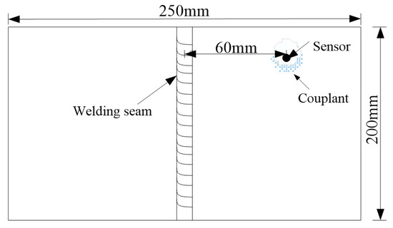 The DS5-8A AE system (BeiJing Softland Times Scientific&technology Co.LTD, Beijing, China) was used to collect the welding crack AE signal, which provided the experimental data. The DS5-8A AE system was produced by Soft Island Times Technology Co., Ltd. The sensor model was RS-15A, the front amplifier model was Smart AE. The AE sensor installation procedure in the welding process included the following. Firstly, the position of the sensor on the specimen was sanded and smoothed in the process of the welding experiment, and secondly, the sensor was pasted before welding. The distances of the location and the welding seam was 60 mm. Finally, the coupling between the sensor and the specimen was added to avoid a loss of signal caused by the air barrier. The specific sensor placement is shown in Figure 11. In order to effectively collect experimental signals, it was necessary to set up the sampling frequency, hit dimension time, hit locking time, waveform threshold and other relevant parameters of the AE signal system. The related parameter settings are shown in Table 2.