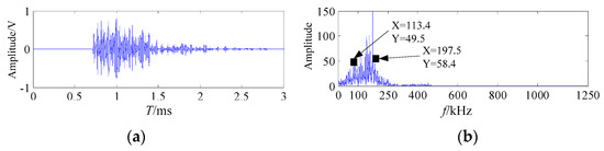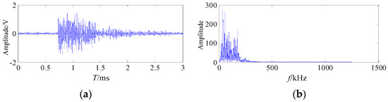 The signal waveform related to the crack characteristics was selected to be processed and analyzed. The waveforms and the frequency spectrum of the welding crack AE signal are shown in Figure 12.