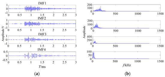 The proposed noise reduction method was performed to the welding crack AE signal. Firstly, the welding crack AE signal was decomposed by EMD. The first four IMF components waveforms and the frequency spectra of the AE signals are shown in Figure 13.