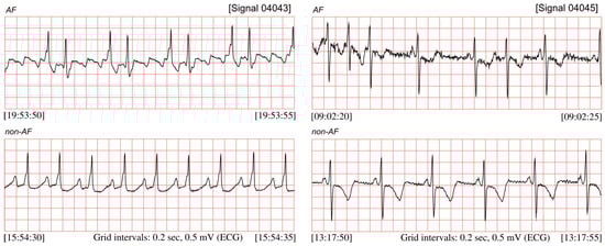Figure 1 presents the ECG signals from the MIT-BIH Atrial Fibrillation database (MIT-BIH AF) published on PhysioNet [4,5,6], comprising both segments with the AF episodes and non-AF segments. AF episodes occur irregularly and may last from a few heartbeats to hours, which significantly hinder the possibility to diagnose the silent AF by means of occasionally performed ambulatory ECG recordings. It implies that the longer the recording, the higher chance to detect the silent AF episodes [7,8]. The most efficient techniques of long-term monitoring are: Holter monitor, continuous telemetry [9,10,11,12], or implementable devices with internal memory [13,14,15]. However, visual analysis of long 24-h recording requires a lot of time and efforts from the cardiologists, thus the methods for automated detection of atrial fibrillation are needed to improve the objectivity of interpretation. When based on ECG, the efficient automated AF detection requires a high quality signal. It may not be ensured by the long-term monitoring techniques which usually comprise periods of daily physical activity of the patient which distort the ECG signal.