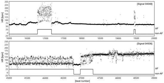 The AF episode is manifested in ECG by significant changes of duration of the beat-to-beat (RR) intervals [16,17,18,19], see Figure 1. However, the RR intervals irregularity caused by AF occurrences is much more easy to observe after converting RR intervals into the instantaneous heart rate (HR) signal (Figure 2). The presented HR signals confirm that AF episodes occur very accidentally, and they can last a few seconds (signal 04048), but also expand to long lasting episodes (signal 04936).