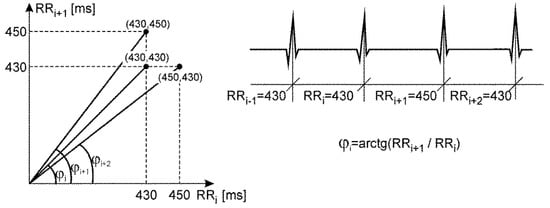 - The definition of de Haan’s index (STI_Haan) is based on a polar coordinate system whose both axes refer to RR intervals expressed in milliseconds, and points represent the pairs of subsequent intervals (RRi−1, RRi), as shown in Figure 3. STI_Haan is determined as the interquartile range of the angles φi between the lines connecting the point with origin of the coordinate system, and the X axis, designated for subsequent periods RRi:where: i = 1, 2…N,N—number of beats.