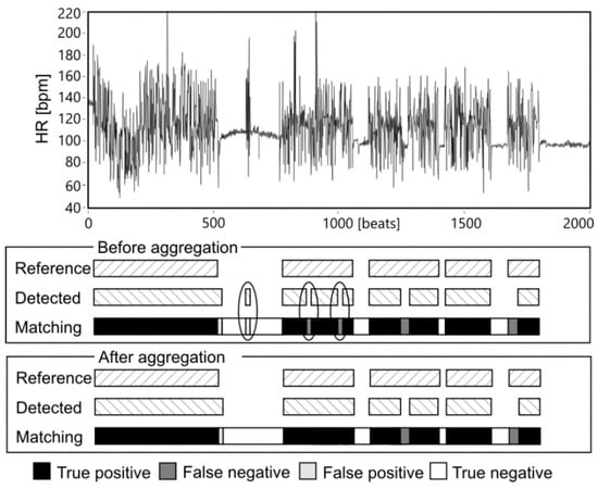 An example of matching the reference and detected AF episodes before and after aggregation. Accidental changes of AF status eliminated in the aggregation stage are marked.