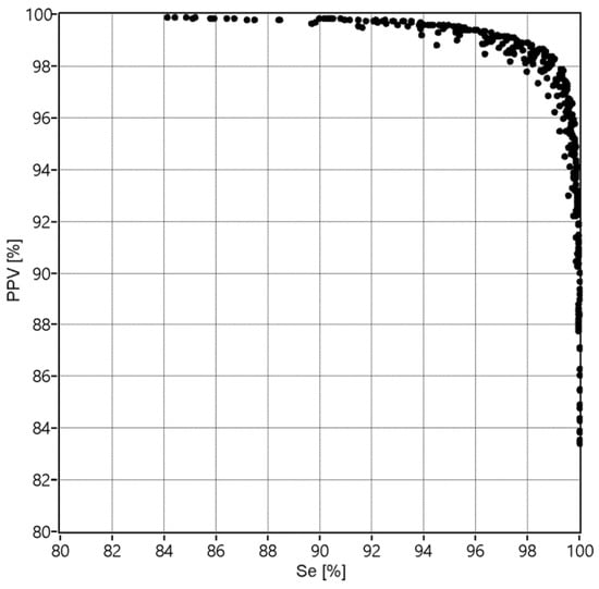 The results obtained after LSVM classification (for division of the higher FSALL = 97.38%, that has been noted among the fifty various divisions in the training data TD4) were used for final AF detection—aggregation of classified heartbeats into AF episodes. Reference AF episodes and the detected ones are expected to overlap each other, but usually they overlapped partially, leading to the cases shown in Figure 4. The TP, TN, FP and FN cases were used to calculate the values of Se, PPV and FS during the process of finding the optimal parameters of the validation window width and the percentage threshold. During that process the window width was changed from 10 to 190 beats with step of 10 beats, while the threshold from 5 to 95% with 5% step. Figure 5 presents how considered values affected the Se and PPV, where each of 361 points refers to a given pair of window width and threshold values.