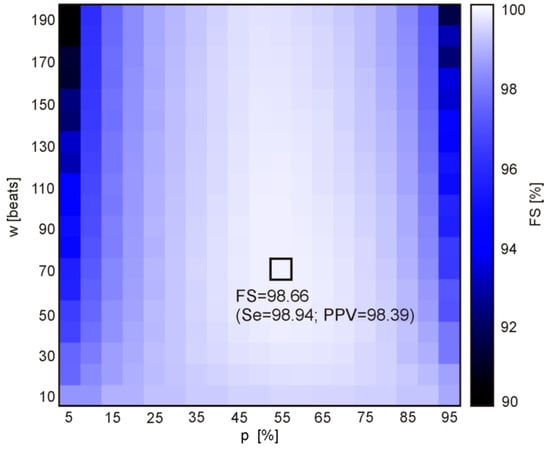 The aggregation of the classified heartbeats should lead to removal of accidental changes of heartbeat status, and thus to obtain more reliable information on AF episodes. This process is controlled by two parameters: the window width and percentage threshold. Each heartbeat status is validated in symmetrical window by checking if the number of the heartbeats with the same status exceeds the percentage threshold. We defined the percentage threshold for the AF status, as the number of heartbeats classified as AF to the number of all beats in the analyzed window. If the threshold is exceeded the AF status remains unchanged, otherwise is set to non-AF. The optimal values of the control parameters (window width and the percentage threshold) have been found to ensure the best AF detection performance expressed by the maximal value of the F-Score.