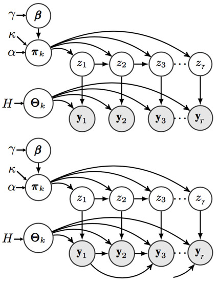 The infinite Hidden Markov Model (iHMM) also known as the Hierarchical Dirichlet Process HMM (HDP-HMM) is a Bayesian nonparametric approach to the HMM first proposed by Beal et al. [31] then formalised by Teh et al. [32]. The nonparametric formalisation tackled the limitations of the traditional HMM of needing to pre-specify the structure of the model allowing it to automatically infer in adaptive manner the complexity depending on the amount of data observed. Building on the iHMM, Fox [33] included linear AR dependence between the observation sequence to form the AR-iHMM (or also known as HDP-AR-HMM). Figure 1 depicts the Probabilistic Graphical Model (PGM) representation of the iHMM and the AR-iHMM.