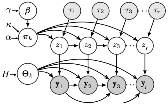 where measures are conditionally independent given . Intuitively, Equation (7) means that random distributions vary around with variability governed by , whereas varies around the base distribution H with variability . Including explicit hyperparameter controlling the self-transitions probability in the AR-iHMM [31,33] we can summarize the full AR-iHMM as follows,
