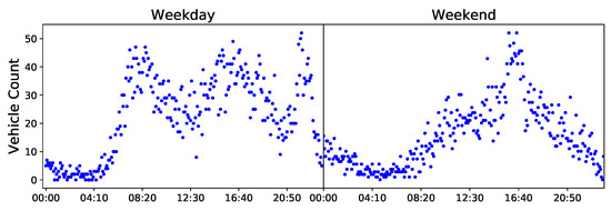 Scatter plots for vehicular density counts on an average game day on a weekday (left) and weekend (right). The first two distinct peaks on the weekday represent the morning and afternoon traffic peaks respectively, whereas the sharp peaks around 23:00 on the weekday and on 16:30 on the weekend represent traffic caused by fans leaving the stadium after a baseball game.