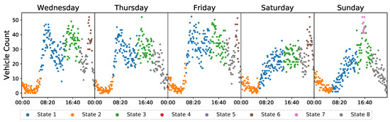 Scatter plots for vehicular density counts. Each colour represents a specific state that the respective observations was clustered into. Morning and evening traffic peaks on weekdays are clustered into state 1 (blue) and state 3 (green), respectively. Traffic caused by evening baseball games near 23:00 (Wednesday, Friday and Saturday) have been clustered into state 6 (brown), whereas traffic peaks caused by afternoon games at about 16:30 (Sunday) were clustered into state 7 (pink).