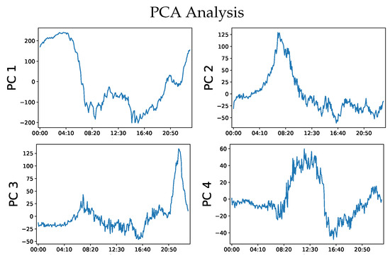 Figure depicting the first four (PCs with the largest eigen values in the PCA analysis of the Dodgers loop sensor dataset). PC 2 capture the dynamics of the morning peak; PC 3 represents the sharp traffic rise due to the evening baseball game, which commonly occurs on weekdays and Saturdays; and PC 4 captures the dynamics of the weekend light midday traffic.
