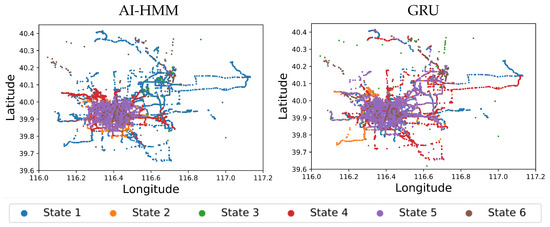 Results obtained from analysing 10 taxi trajectories using the novel AI-HMM framework (left) and the GRU technique (right). Each data point corresponds to a GPS observation where its colour represents the state to which it was assigned. The plots depict the longitude against latitude l reconstructions of the movements of the taxi locations on a map.