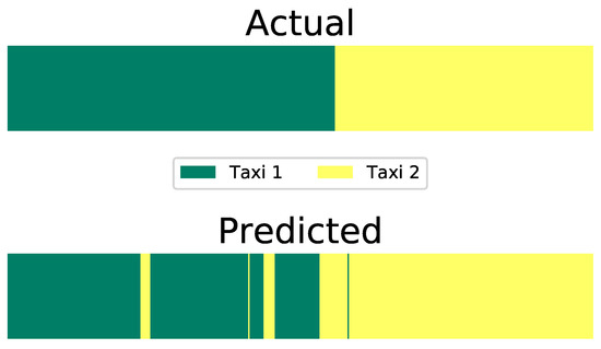In cases where the contextual input is known or can be assigned to the data, the AI-HMM demonstrates highly informative unsupervised analysis results outperforming other commonly used time series sensor analysis techniques in the literature. However, it is often the case that is partially missing, and must therefore be inferred from the data adaptively. To demonstrate the performance of adaptively inferring the input vector given a pre-trained model, another experiment was conducted on the T-drive dataset where was used to indicate the taxis identity. The full data of two different taxis was extracted and separated into 75% training set and 25% test set. For the training data points, the input was set to representing taxi 1 and taxi 2, respectively, and they were fit with the AI-HMM model to learn all remaining parameters and variables and . The aim for the test data was to infer the values of as well as using Equation (13) assuming they are unknown.