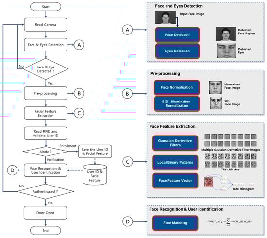 The system provides two different operation modes, i.e., user registration mode and user authentication mode. In user registration mode, the facial images of a user are acquired by a camera, and then the face and eyes detector finds the facial region and localizes the eyes’ positions. The detected face images are normalized with localized eyes positions. From a normalized face image, the facial feature is extracted by means of Gaussian derivative filters and a LBP histogram. While the facial feature is extracted, the system reads the user ID from the RFID card that is held by the user. The extracted facial features and user ID are stored in the database (DB) for user authentication.