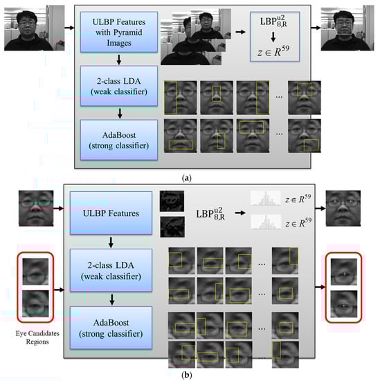 The local binary pattern (LBP)-AdaBoost approaches to face detection (a) and eye detection (b) for facial image alignment. LDA: linear discriminant analysis.