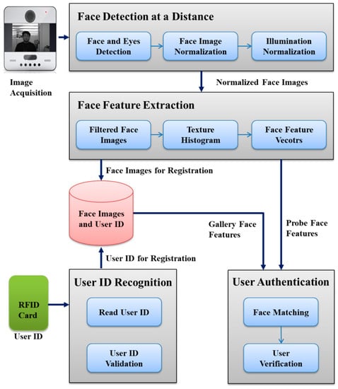 This subsection presents the overall architecture of the proposed user-friendly access control system based on dual-factor authentication i.e., RFID token and HFR, which verifies the identity of the RFID card holder to prohibit an unauthorized user from gaining access by obtaining an authorized RFID card. The system mainly consists of four parts: (i) face detection at a distance, (ii) facial feature extraction, (iii) user ID recognition, and (iv) user authentication as shown in Figure 7.