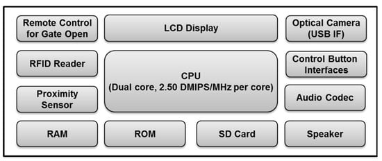The hardware configuration of the proposed stand-alone access control system is provided in Figure 8. It consists of an optical camera, remote controller, RFID reader, proximity sensor, control button interface, audio codec, speaker, and memory devices. This study used an optical camera with a USB interface as an image acquisition device to get high quality face images. It also used an active-type RFID reader with a proximity sensor to provide a user-friendly interface. A user does not need to touch the RFID reader to gain access rights because the system reads the user ID from the active RFID card at a distance when the proximity sensor detects a user. The remote controller emits the signal to open the gate when an authorized user is close to the system. The distance between a user and the system is computed via calibration of the proximity sensing values. The system alerts significant events, such as user registration completion, user denial, and user authorization using audio voices.