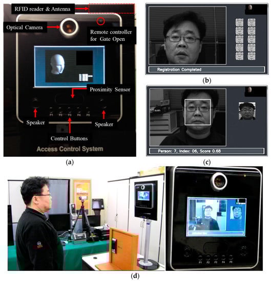 The mockup of the proposed user-friendly, stand-alone access control system based on HFR at a distance with RFID, viz. the BioGate access control system: (a) system configuration of the mockup system, (b) example of user registration, (c) example of user authentication, and (d) example of the experimental environment.