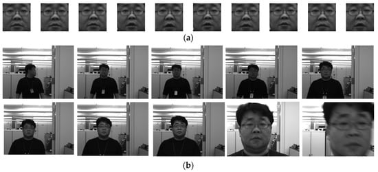Examples of newly collected facial images (for a gallery dataset) and videos (for a probe dataset) in an indoor office environment: (a) examples of registered images normalized from gallery images and (b) examples of probe images extracted from the videos.