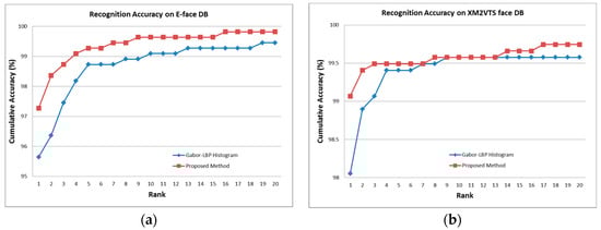 The cumulative accuracies on E-face and XM2VTS face databases are shown in Figure 12. The experimental results showed that the proposed method was suitable for not only face identification, but also face retrieval application.