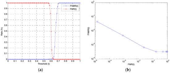 We employed the true acceptance rate (TAR), the false rejection rate (FRR), the false acceptance rate (FAR), and the equal error rate (EER) [38,42,43,44,45,46] as performance evaluation measurements. The TAR is defined as the frequency at which the system correctly verifies a true claim of authorization. The FRR is the frequency of the system rejecting a true claim of authorization. The FAR is defined as the frequency of the system incorrectly accepting an unauthorized user [38,46,47,48,49,50,51,52]. The ERR is defined as the error rate when FAR and FRR are equal for a particular threshold [44]. FNMR(t) and FMR(t) are defined as the distribution of the false non-match rate (FNMR) and false match rate (FMR) with threshold value t varying from 0.0 to 1.0. FNMR is the fraction of genuine comparisons (a user is compared with gallery images of her/himself) that produce a matching score of less than threshold value t. FMR is the fraction of impostor comparisons (a user is compared against gallery images of all other users) that produce a matching score greater than or equal to threshold value t [45,46].