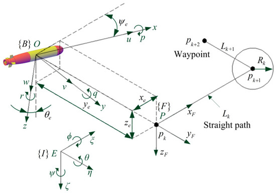As shown in Figure 1, the routes are described in terms of waypoints which are fixed points in {I} frame. The reference path is the straight line between two adjacent waypoints. In order to establish the error model of the straight-line path followed, the path coordinate system is introduced. The current straight path starting at and ending at is defined. Here, the subscript k represents the sequence number of the straight path or waypoints. represent coordinates of , and coordinates of . The origin of is placed at with the -axis pointing towards , the -axis pointing to the right, and the -axis pointing down. The and coordinates of the AUV in the frame equal the lateral error and vertical error, respectively. The orientation of {B} in {I} is defined as , and the orientation of {F} in {I} as . and are calculated as follows: