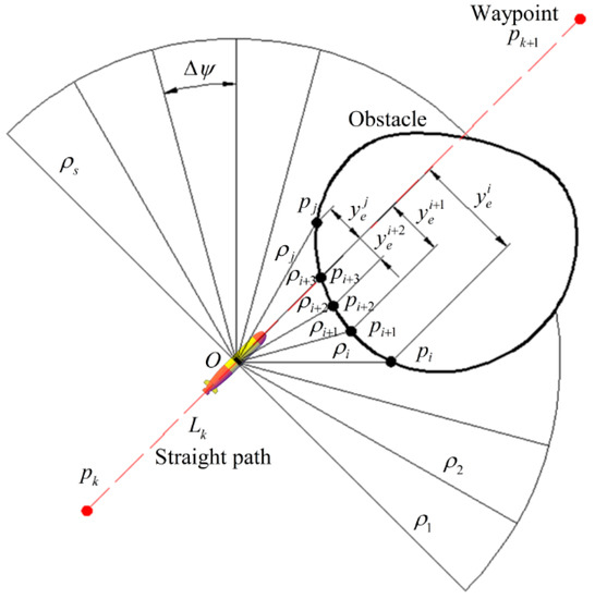 - If all the data are less than zero, then the obstacle is on the left side of the path. At this point, if is satisfied, then set . Otherwise, choose to avoid the obstacle from the right side of the obstacle and set until all the received data ρ values are zero, then set .