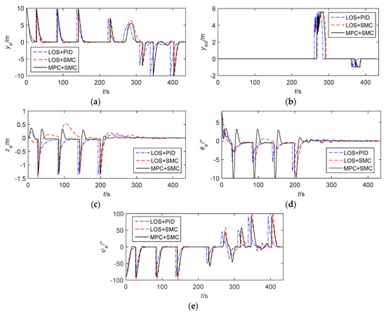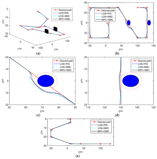 The simulation results are displayed in Figure 3, Figure 4, Figure 5 and Figure 6. Figure 3a shows the simulation results which are displayed in 3D. Figure 3b is the path following result projection in the horizontal plane. Figure 3c–d are partial zooms of horizontal obstacle avoidance. Figure 3e is the path following results projection in the vertical plane. The simulation results show that the tracking performance of the three control methods is nearly ideal. However, LOS+SMC and MPC+SMC work slightly better than LOS+PID when path switching. In addition, MPC+SMC can converge to the expected lateral error faster and more accurately so as to better achieve obstacle avoidance.