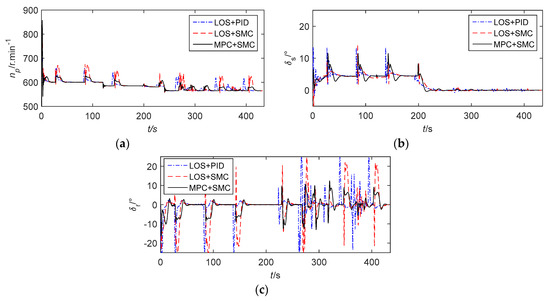 The actual control input variables. (a) The speed of the propeller. (b) The sternplane rudder angle. (c) The vertical rudder angle.