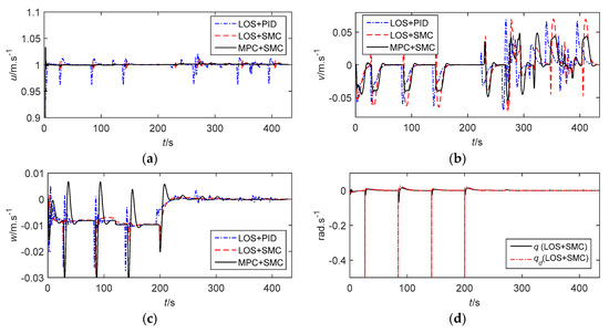 In addition, the MSE of vertical rudder angle is reduced by about 40% compared with that of the traditional control methods, which is more conducive to the system stability and saves more energy. Figure 6 shows the velocities of the AUV and the stability constraints of MPC. The forward speed can converge to the expected value. However, the performance of LOS+SMC and MPC+SMC is better than that of LOS+PID because the forward speed is more stable. At the same time, it can be seen clearly that although the AUV generates certain lateral and vertical velocities due to the coupling between motions, both lateral and vertical velocities are small and convergent. When LOS+SMC is adopted, the expected angular velocities are too large during path switching, which is the reason for the saturation of the rudder angle. The angular velocity of the AUV can not only converge to the expected value but is also within the constraint range with the MPC+SMC method. Figure 6h illustrates the stability constraints of MPC.