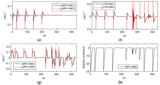The velocities of the AUV and the stability constraints of MPC. (a) Displacement velocity of the AUV (surge). (b) Displacement velocity of the AUV (sway). (c) Displacement velocity of the AUV (heave). (d) Angular velocity of the AUV with LOS+SMC (pitch). (e) Angular velocity of the AUV with MPC+SMC (pitch). (f) Angular velocity of the AUV with LOS+SMC (yaw). (g) Angular velocity of the AUV with MPC+SMC (yaw). (h) The stability constraints of MPC.
