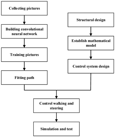 After the image collected by the camera was transmitted to the computer in real time, the ideal path was fitted by the industrial computer using the trained model, and then the computer sent the robot’s moving control command to the STM32F103C8T6 microcontroller through the recommended standard232 (RS232) interface. The microcontroller sent two identical pulse with modulation (PWM) pulse signals to the signal control end of the ZM-6615 direct current (DC) brushless driver, which was used to drive the two rear wheels of the robot. The robot could move by itself. When the robot went astray, the microcontroller would send a PWM pulse signal to the control end of the 2HD8080 stepping motor driver to adjust the direction. Meanwhile, the hall sensor transmitted the steering angle collected in real time back to the microcontroller for precise steering. The control process is shown in Figure 13.