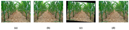 To shorten the training time, the difference of gaussian (DOG) pyramid model [23], based on Gauss kernel, was used to reduce the image of a single corn rhizome to the same scale to form a data set. Considering the sake of parameter accuracy and the normal work of the network model, we used rotation transformation, image transformation and addition of noise to the collected image as data enhancement, as shown in Figure 4. The enhanced data set was divided into a training set and a test set in proportion 7:3. Considering the global learning rate of region-CNN (R-CNN) set at , the network was trained. The output of CNN in this paper is the position of the corn rhizome in the picture.