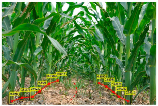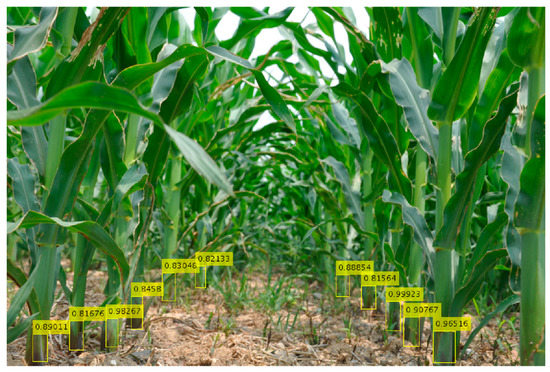Next, we tested the rhizomes of several maize plants in an inter-row environment. Viewing Figure 6, it can be seen that the target rhizome with obvious characteristics can be accurately identified and, even with leaf occlusion, the detection accuracy can be ideally achieved. However, the recognition probability of the model for the distant rhizome was not very high, and some rhizomes were not detected, but the overall recognition effect was quite good.
