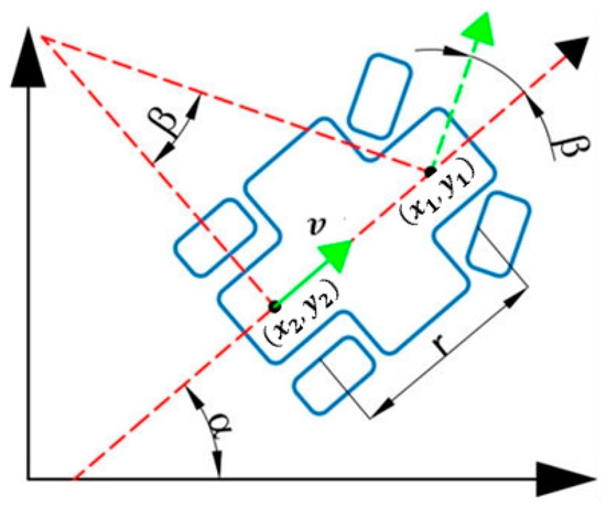 The robot involved in this paper mainly performed plant protection operations in the field. Regarding the robot, two front wheels were designed for turning functions and two rear wheels for driving purposes. Concerning terms of direction, the two rear wheels always remained consistent with the robot to establish a 2-DOF robot model. The robot was simplified as follows in modeling: