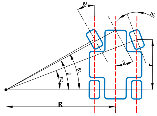 According to Ackerman’s principle, the steering mechanism of the four-wheeled robot during steering can make the steering angle of the inner wheel 2–4 degrees larger than that of the outer one, so that the center of the trajectory of the four wheels may intersect at a point, which is located on the extension line of the rear axle. Based on Ackerman steering geometry, the kinematics model of robot steering was established, as shown in Figure 8.