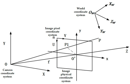 Shown in Figure 11, point is the origin of the camera coordinate system, with its -axis parallel to the x-axis, its -axis to the y-axis, and the -axis perpendicular to the image plane. Concerning the camera coordinate system, the 3D homogeneous coordinates of P1 point were ; point P1 was the imaging point of point P in the world coordinate system. According to the relationship of the space transformation model, the transformation formula between them could be obtained as follows: