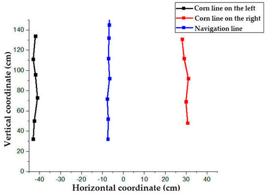 The crop line between corn lines obtained by this method is shown as a solid line in Figure 10, and the final driving path is shown as a dotted line by fitting with a least square method. Regarding the actual situation, considering the uncertainty of corn germination, there may be a lack of seedlings on one side during the movement of the robot. It can be found, seen in Figure 10, that the robot could recognize five to seven seedlings in front while moving. When the number of missing seedlings is small, the path fitting would not be affected. When there are a greater number of missing seedlings on one side, the path could be planned according to the rhizomes on the other side. The experiment which was conducted in the Huanghuaihai Region, had a row spacing of 60 cm, thus, the position short of seedlings should be supplemented at the corresponding spot 60 cm away from the other side of the rhizome and, then, the path should be fitted according to the original method.