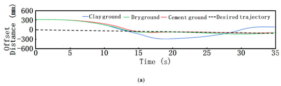 During the actual work of the robot, the expected path was obtained by processing the image and fitting the center line of the corn row after the Kinect camera took in the corn row environment. Therefore, the center line was set as the expected path in the joint control simulation of path tracking. Under the premise that the robot traveled at a speed of 0.3 m/s, the simulation conditions of clay, dry soil and cement pavement were selected to analyze the robot’s path tracking performance. The simulation results are shown in Figure 15 and Figure 16. The red curve, blue curve and cyan curve in Figure 15a show the path tracking simulation results of the robot under the conditions of cement road, dry soil and clay respectively. It can be seen from the Figure that, under the condition of the cement road, the path tracking effect of the robot was at its best, followed by the condition of the dry soil, and the robot could not track the desired path well under the condition of the clay due to the tire slipping; viewing Figure 15b, it can be observed that the robot showed very stable yaw acceleration under the conditions of cement pavement and dry soil after tracking the expected path, but the yaw acceleration fluctuated greatly under the conditions of clay; shown in Figure 15c, the robot had a very stable transverse movement under the conditions of cement pavement and dry soil after tracking the expected path, while the transverse displacement speed fluctuated greatly under the condition of clay. It was mainly because the soft clay had a high moisture content, poor adhesion, and high road resistance, which made the stress transfer process to the vehicle at the time very complicated; the driving resistance increased and the adhesion coefficient decreased, which caused the tires to slip and deviate from the originally fitted path. The actual working condition involved the field environment where corn was in the middle and later period of its growth and the road condition was dry soil. According to the simulation results, the robot could track the path stably in such field environment, and the real-time simulation results are shown in Figure 16.