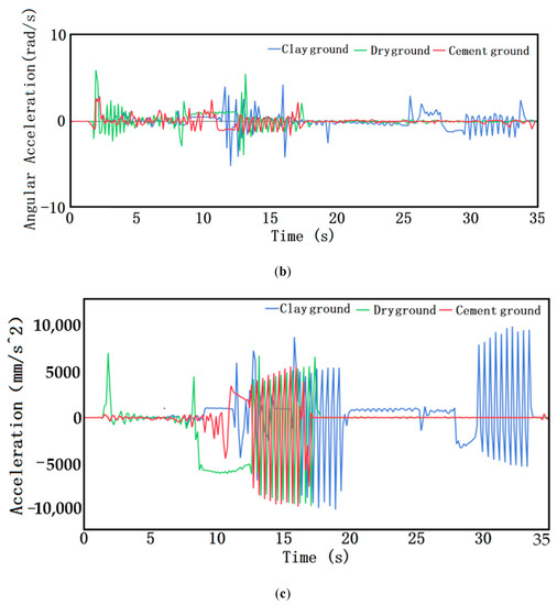 Simulation results: (a) Path tracking results of robot on different roads; (b) Acceleration diagram of robot’s yaw angle under different road conditions; (c) Yaw acceleration diagram of robot under different road conditions.